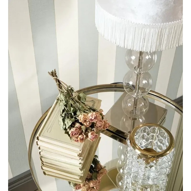 Papel pintado de rayas que contrastan y alternan sus tonos suaves. Una delicada línea dorada los separa, definiendo sus bordes. Un clásico, de estilo británico, actualizado con los colores de tendencia actual, y diseñado con un look sofisticado.