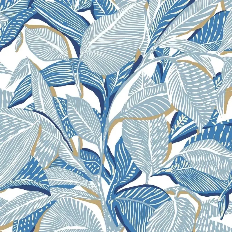 Papel pintado floral con hojas grandes azul y blanco, perfecto para crear espacios serenos con un toque de carácter.
