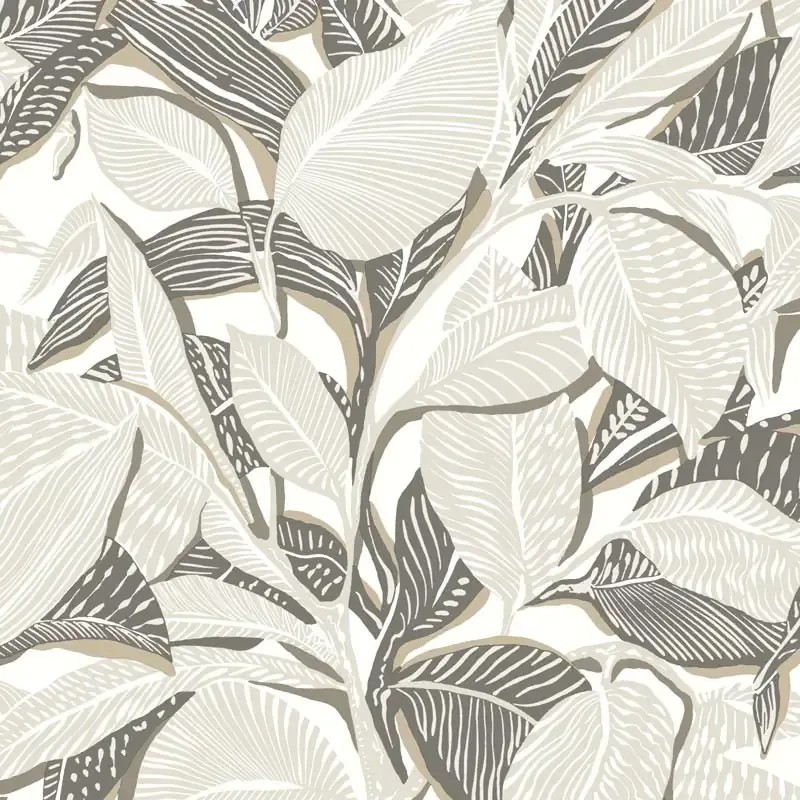 Papel pintado floral blanco y gris con hojas grandes, ideal para salones o dormitorios con estilo sobrio y atemporal.