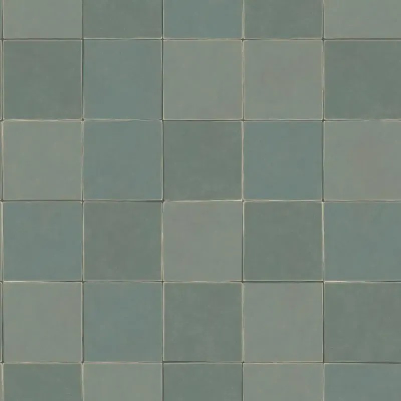 Papel pintado azulejo zellige de cerámica marroquí verde, ideal para baño, con un acabado elegante que aporta profundidad visual al ambiente.