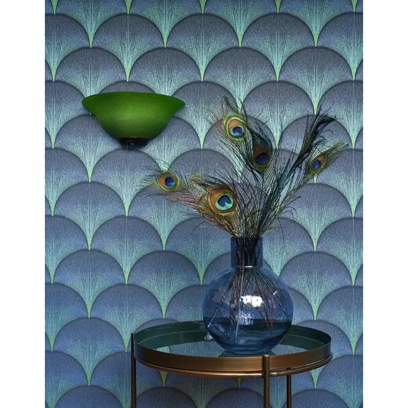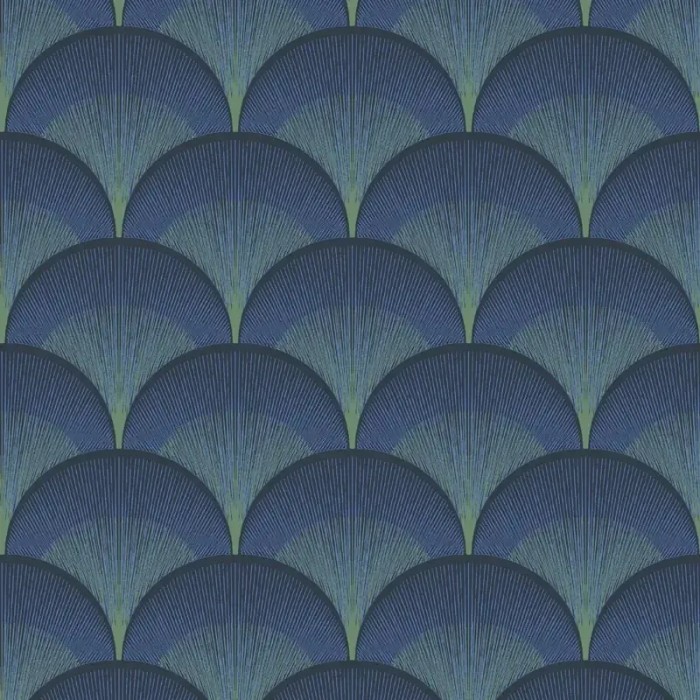 Papel pintado art deco moderno azul con brillos, una elección sofisticada para estancias que buscan textura y personalidad.