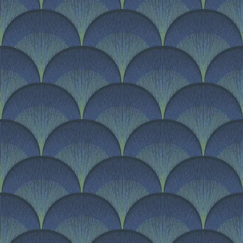 Papel pintado estilo Art Deco verde con formas geométricas de abanico