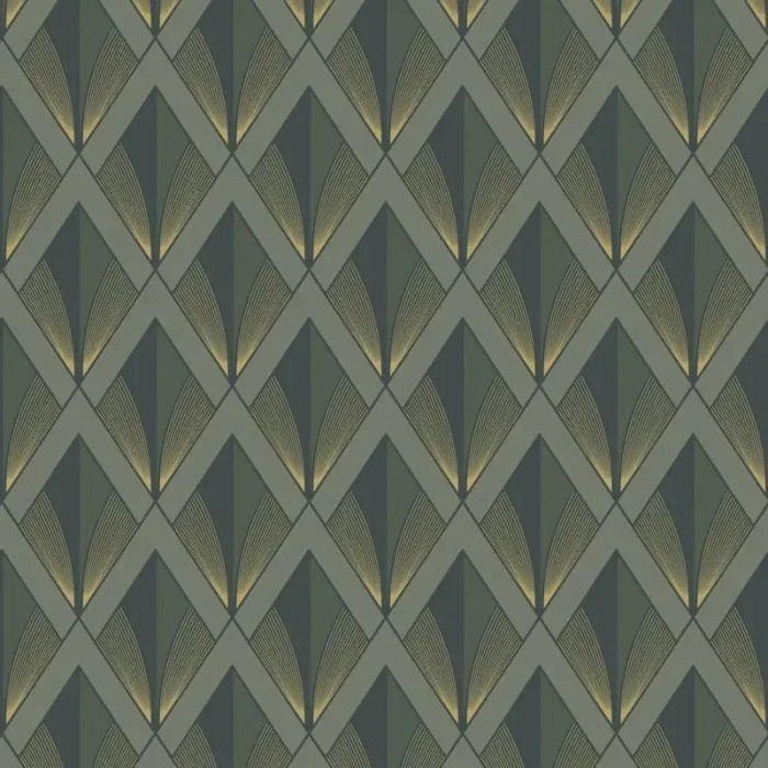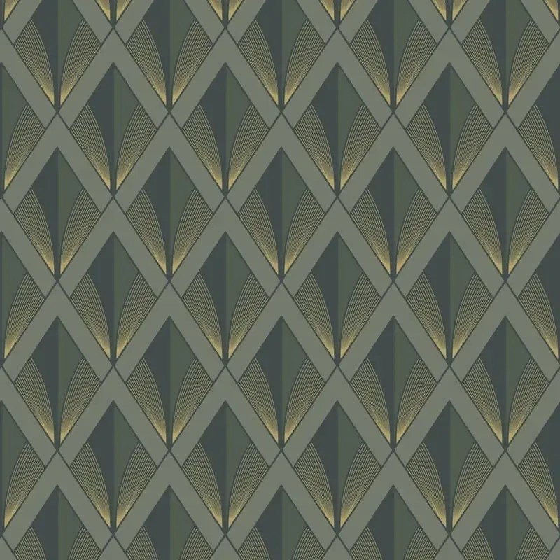 Papel pintado elegante estilo art deco de rombos negros y dorados, perfecto para crear espacios serenos con un toque de carácter.