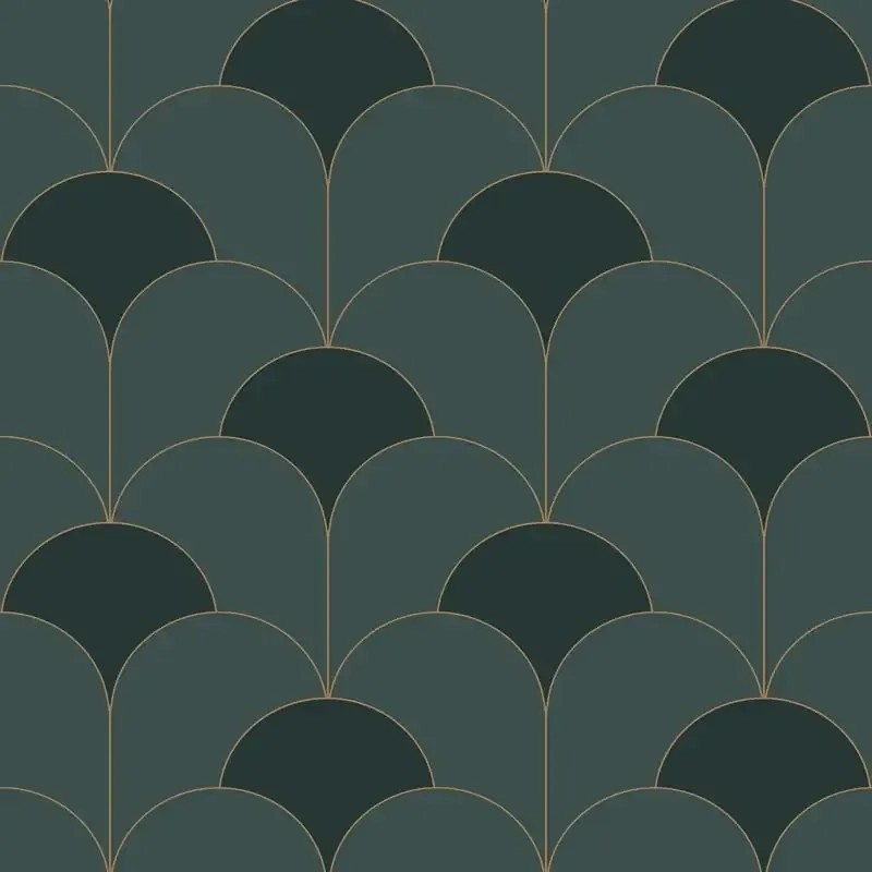 Papel pintado elegante con formas de arcos metalizados estilo art deco, ideal para salones o dormitorios con estilo sobrio y atemporal.