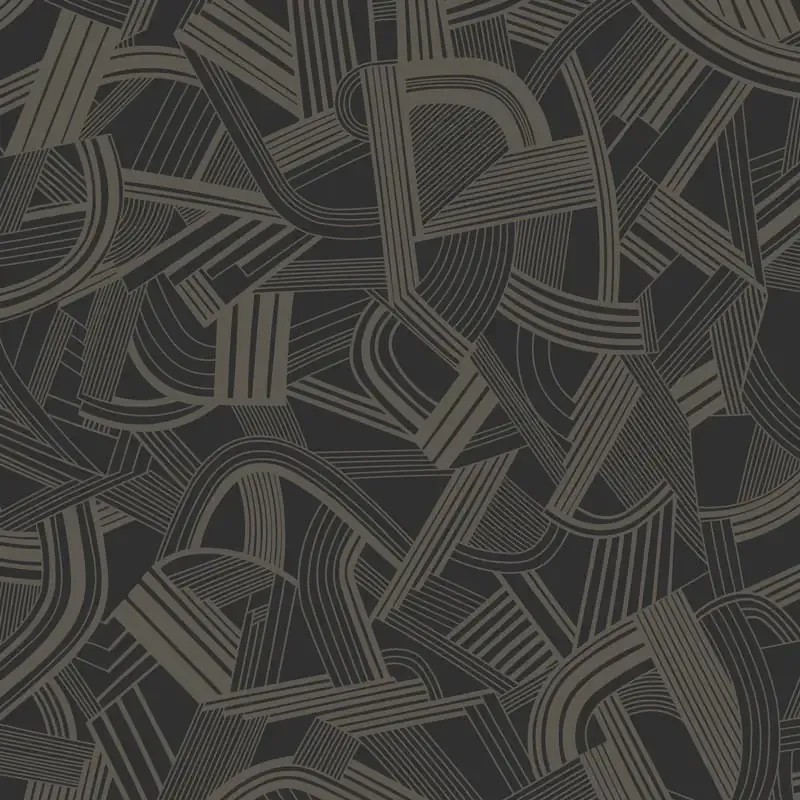 Papel pintado art deco negro y dorado con original diseño de arpas y partituras, con un acabado elegante que aporta profundidad visual al ambiente.