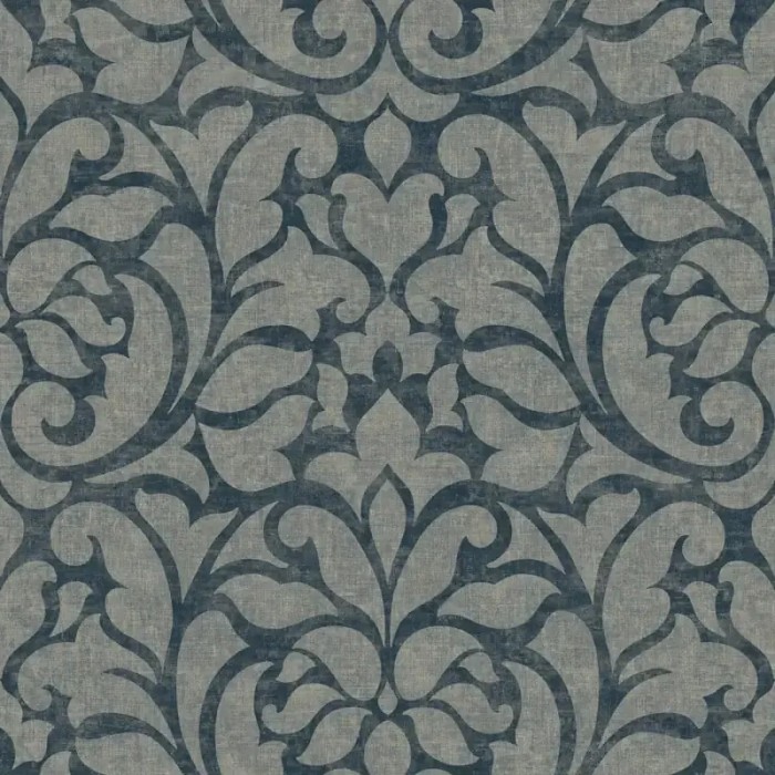 Papel pintado damasco azul y gris para salones elegantes, con un acabado elegante que aporta profundidad visual al ambiente.
