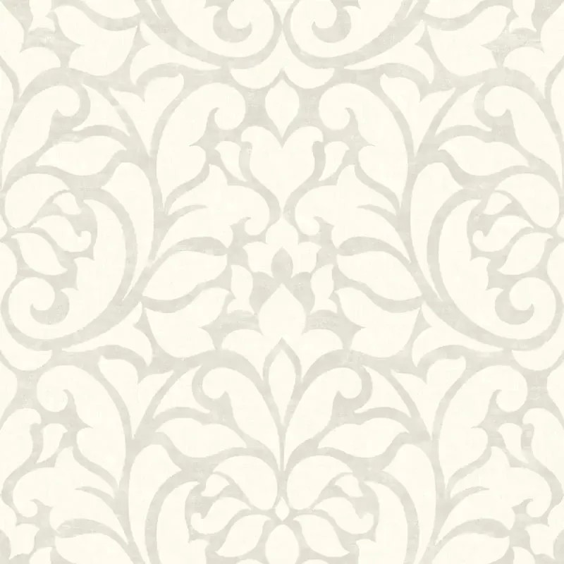 Papel pintado damasco beige con ornamentos efecto lino, con un acabado elegante que aporta profundidad visual al ambiente.