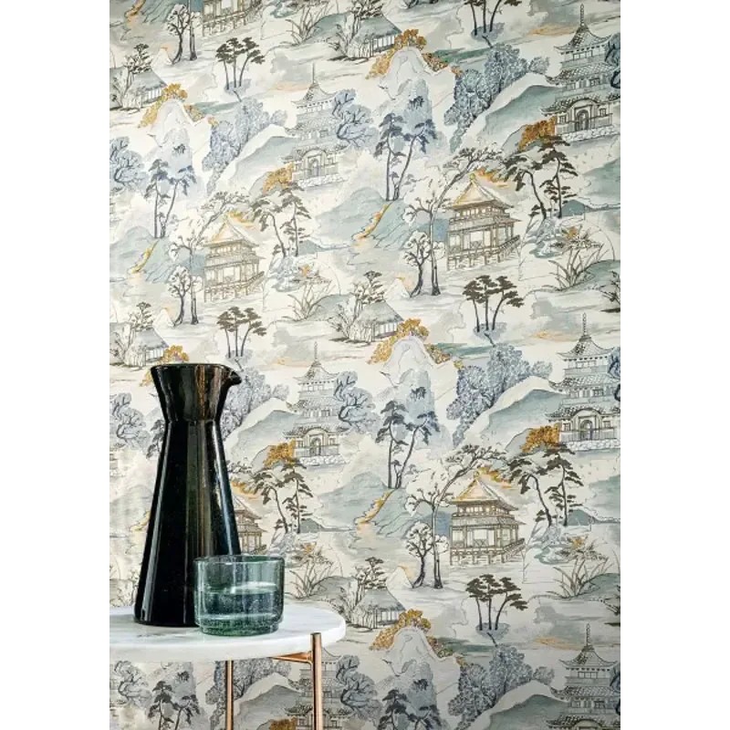 Papel pintado oriental paisaje japonés gris azulado y marrón de Casamance, colección Archipel. Calidad vinílico lavable, medidas: 70 cm x 10 m.