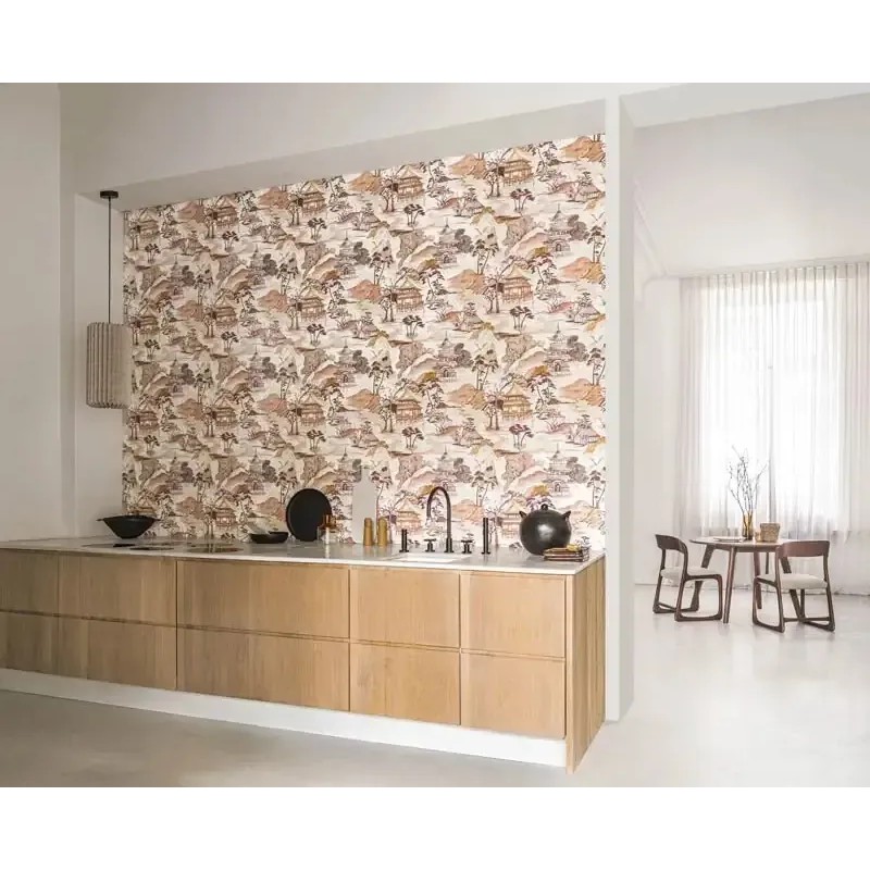 Papel pintado oriental paisaje japonés verde estilo acuarela de Casamance, colección Archipel. Calidad vinílico lavable, medidas: 70 cm x 10 m.