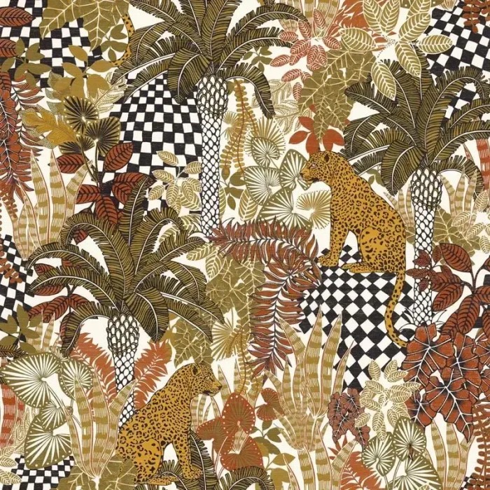 Papel pintado tropical selva panteras caqui de Casamance, colección Aventura. Calidad vinílico lavable, medidas: 70 cm x 10 m.