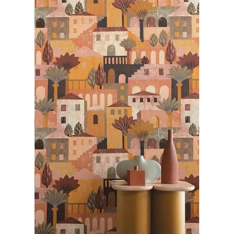 Papel pintado figurativo Cinque Terre paisaje beige y marrón de Casamance, colección Aventura. Calidad vinílico lavable, medidas: 70 cm x 10 m.