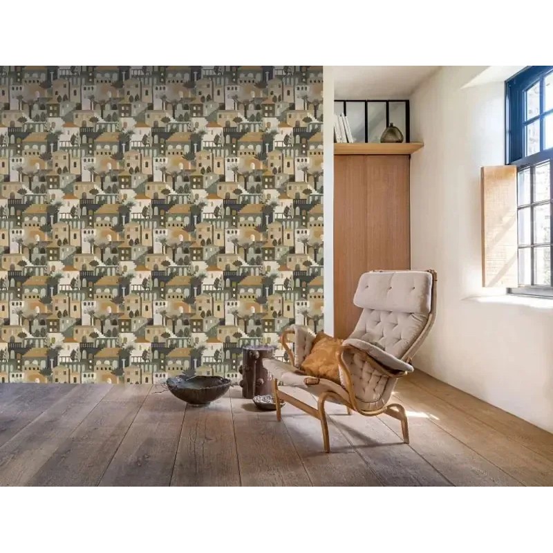 Papel pintado figurativo Cinque Terre paisaje marrón y naranja de Casamance, colección Aventura. Calidad vinílico lavable, medidas: 70 cm x 10 m.