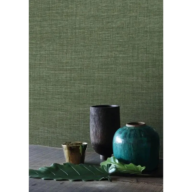 Papel pintado fibras naturales imitación rafia verde y marrón de Casamance, colección Aventura. Calidad vinílico lavable, medidas: 70 cm x 10 m.