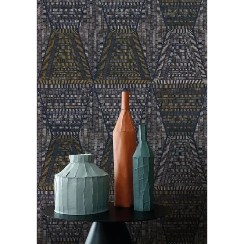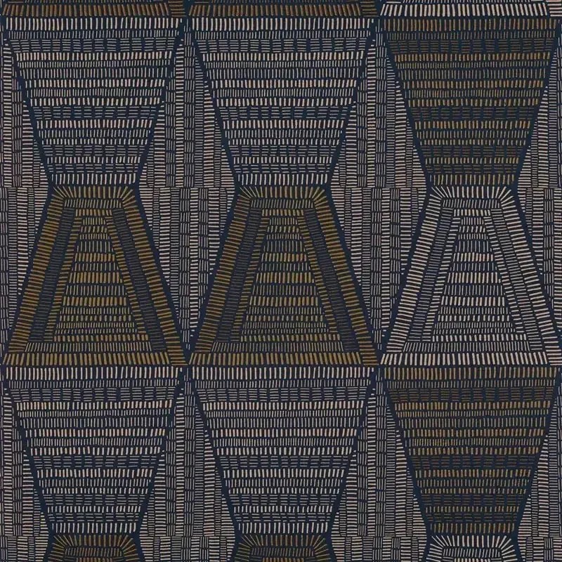 Papel pintado étnico tribal africano azul y marrón de Casamance, colección Mirage. Calidad vinílico lavable, medidas: 53 cm x 10 m.