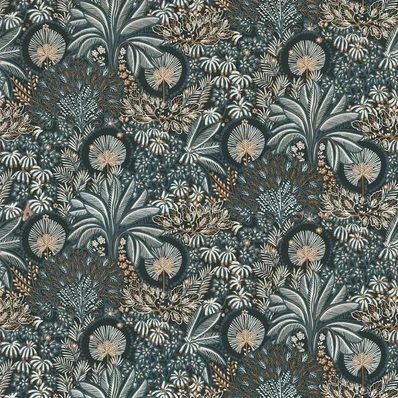 Papel pintado oasis floral moderno cobre y azul de Casamance, colección Nuit D'orient. Calidad vinílico lavable, medidas: 68 cm x 10 m.