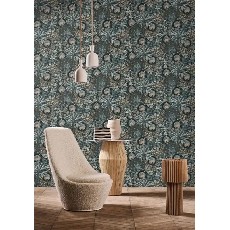Papel pintado oasis floral moderno verde azul y dorado de Casamance, colección Nuit D'orient. Calidad vinílico lavable, medidas: 68 cm x 10 m.