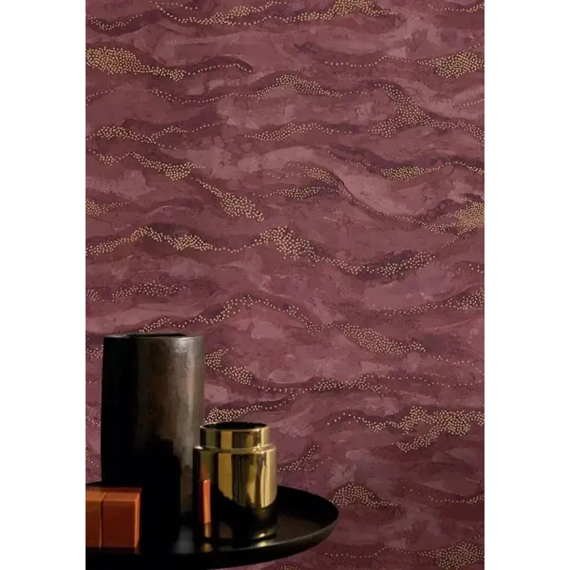 Papel pintado paisaje marino acuarelado rosa y granate de Casamance, colección Nuit D'orient. Calidad vinílico lavable, medidas: 68 cm x 10 m.