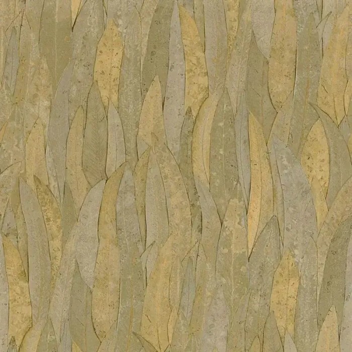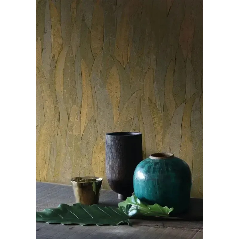 Papel pintado hojas de eucalipto amarillo ocre con textura decorativa de Casamance, colección Golfe Du Bengale. Calidad vinílico lavable, medidas: 70 cm x 10 m.
