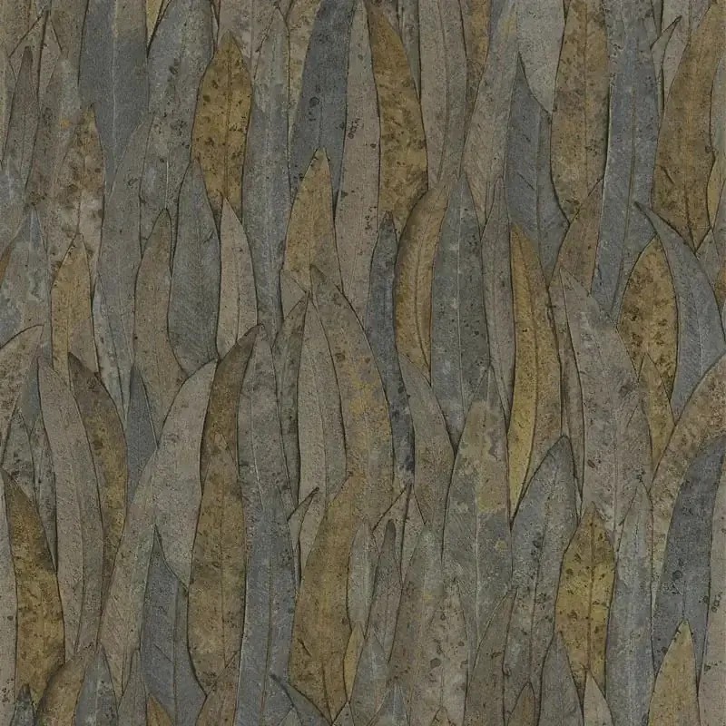 Papel pintado hojas de eucalipto marrón con textura 3D de Casamance, colección Golfe Du Bengale. Calidad vinílico lavable, medidas: 70 cm x 10 m.