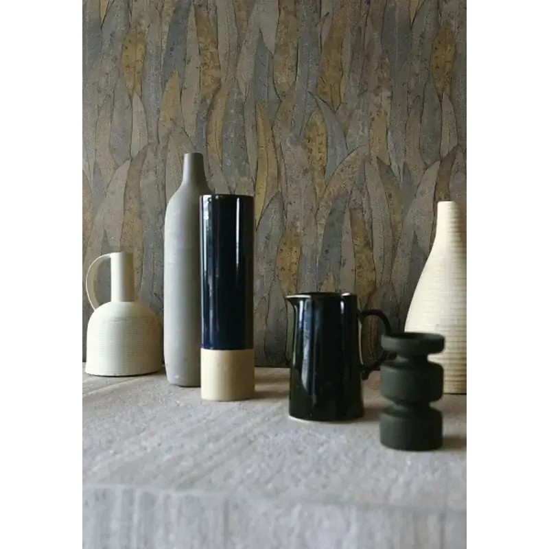 Papel pintado hojas de eucalipto amarillo ocre con textura decorativa de Casamance, colección Golfe Du Bengale. Calidad vinílico lavable, medidas: 70 cm x 10 m.