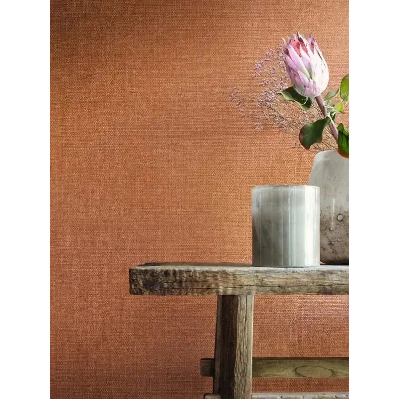 Papel pintado rafia naranja y rosa teñida colorida de Casamance, colección Golfe Du Bengale. Calidad vinílico lavable, medidas: 70 cm x 10 m.