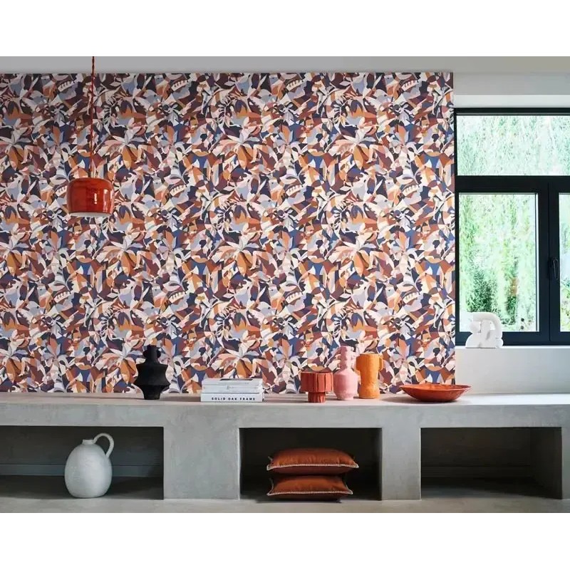 Papel pintado floral abstracto con siluetas geométricas multicolor de Casamance, colección L'ile Aux Oiseaux. Calidad vinílico lavable, medidas: 70 cm x 10 m.