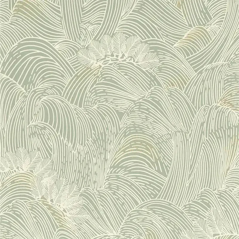 Papel pintado abstracto oleaje verde y dorado metalizado de Casamance, colección L'ile Aux Oiseaux. Calidad vinílico lavable, medidas: 68 cm x 10 m.