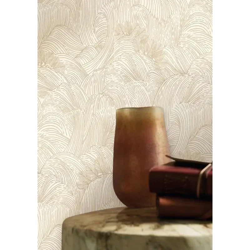 Papel pintado abstracto oleaje blanco con dorado metalizado de Casamance, colección L'ile Aux Oiseaux. Calidad vinílico lavable, medidas: 68 cm x 10 m.