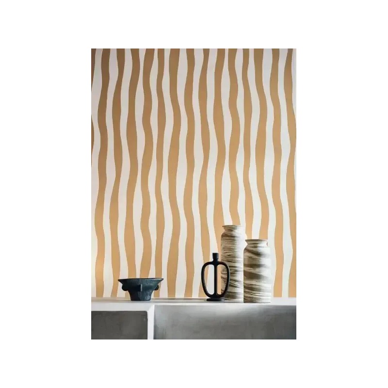 Papel pintado rayas onduladas beige. Aporta un toque único en cualquier estancia de tu hogar. Combina con estilos modernos y clásicos.