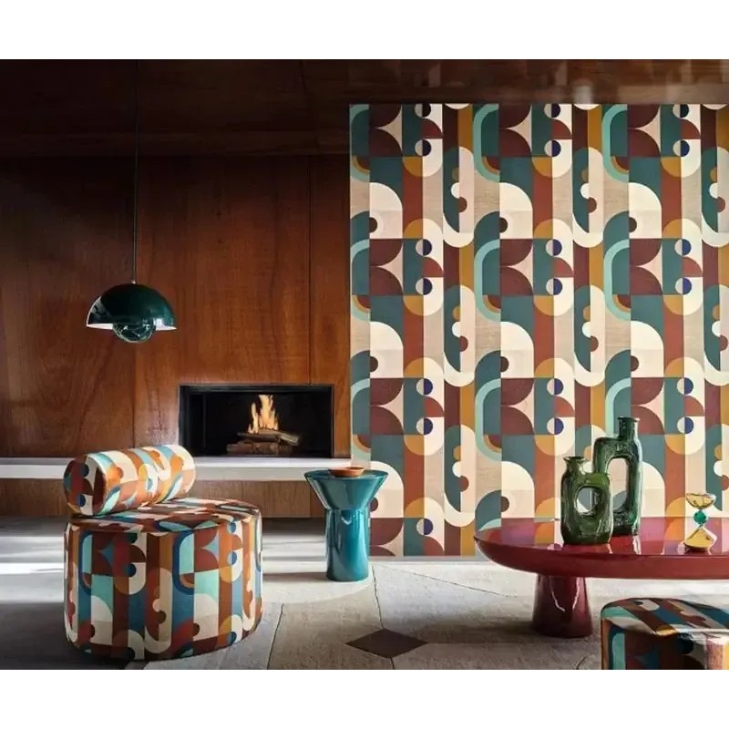 Papel pintado geométrico abstracto multicolor con diseño moderno de Casamance, colección Mouvements. Calidad vinílico lavable, medidas: 70 cm x 10 m.