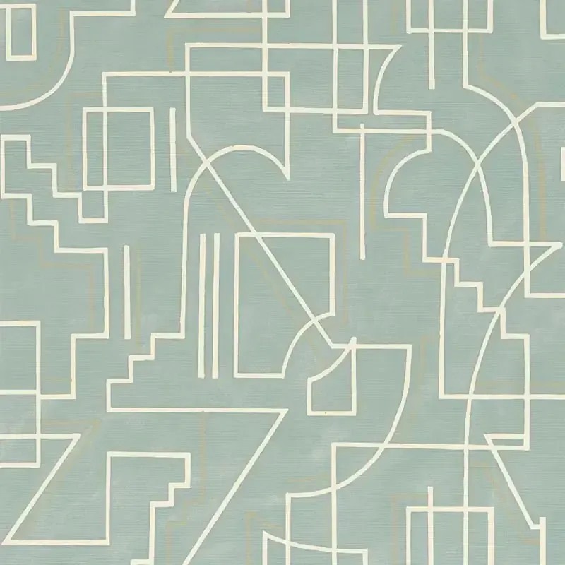 Papel pintado geométrico verde con líneas abstractas de Casamance, colección Mouvements. Calidad vinílico lavable, medidas: 70 cm x 10 m.