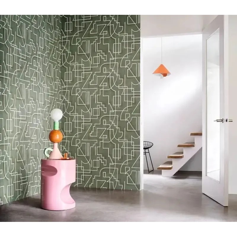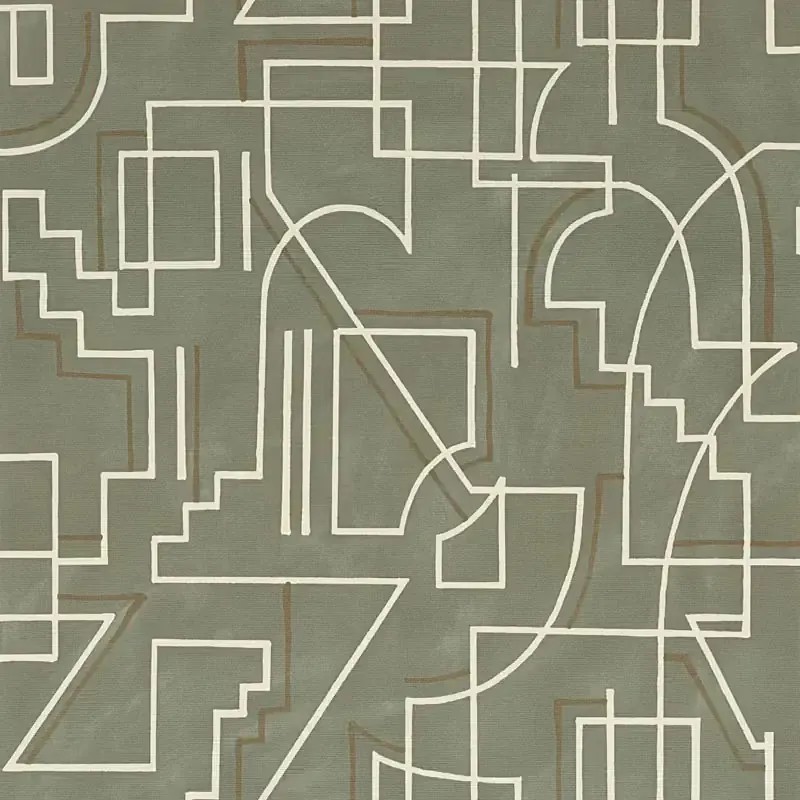 Papel pintado geométrico verde líneas abstractas estilo moderno de Casamance, colección Mouvements. Calidad vinílico lavable, medidas: 70 cm x 10 m.