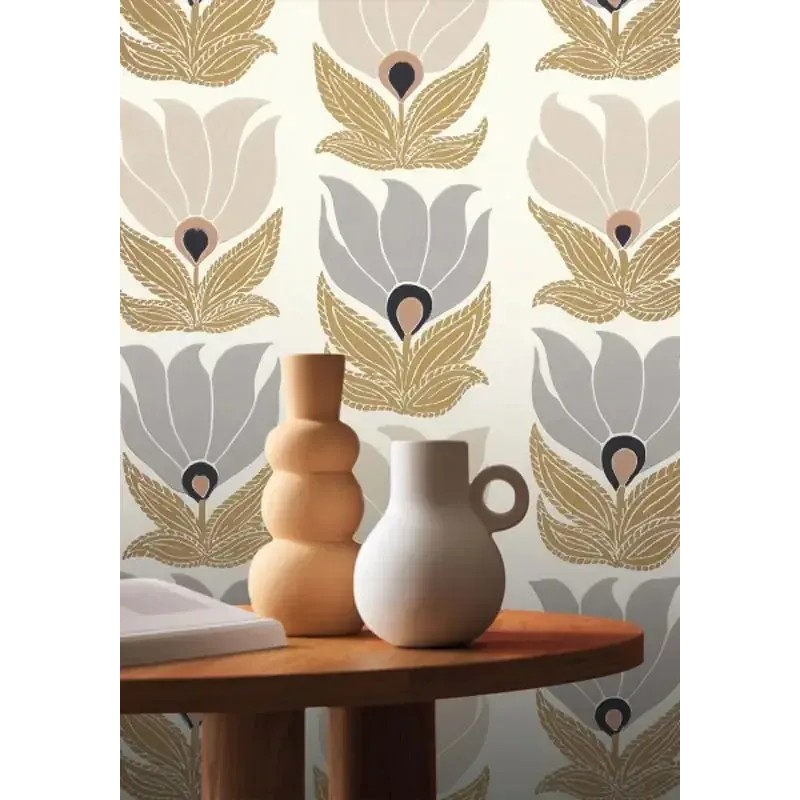 Papel pintado floral Art Nouveau beige de Casamance, colección Square Jasmin. Calidad Tejido no tejido lavable, medidas: 52 cm x 10 m.