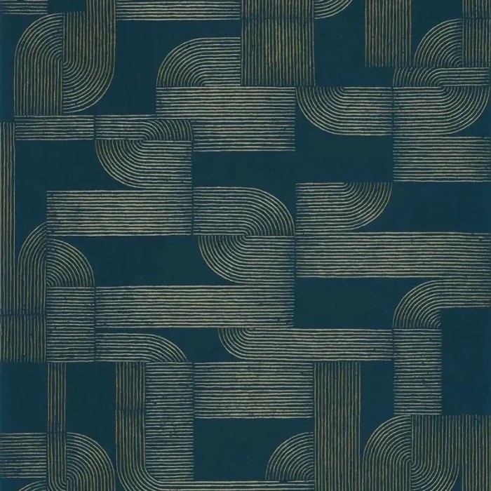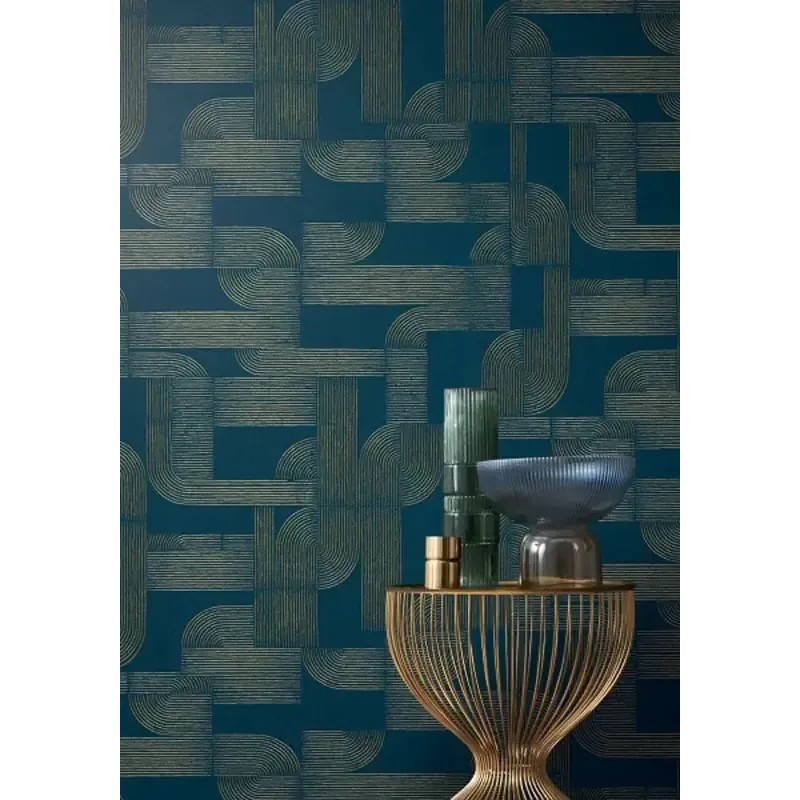 Papel pintado Art Nouveau geométrico verde azul dorado de Casamance, colección Square Jasmin. Calidad vinílico lavable, medidas: 53 cm x 10 m.