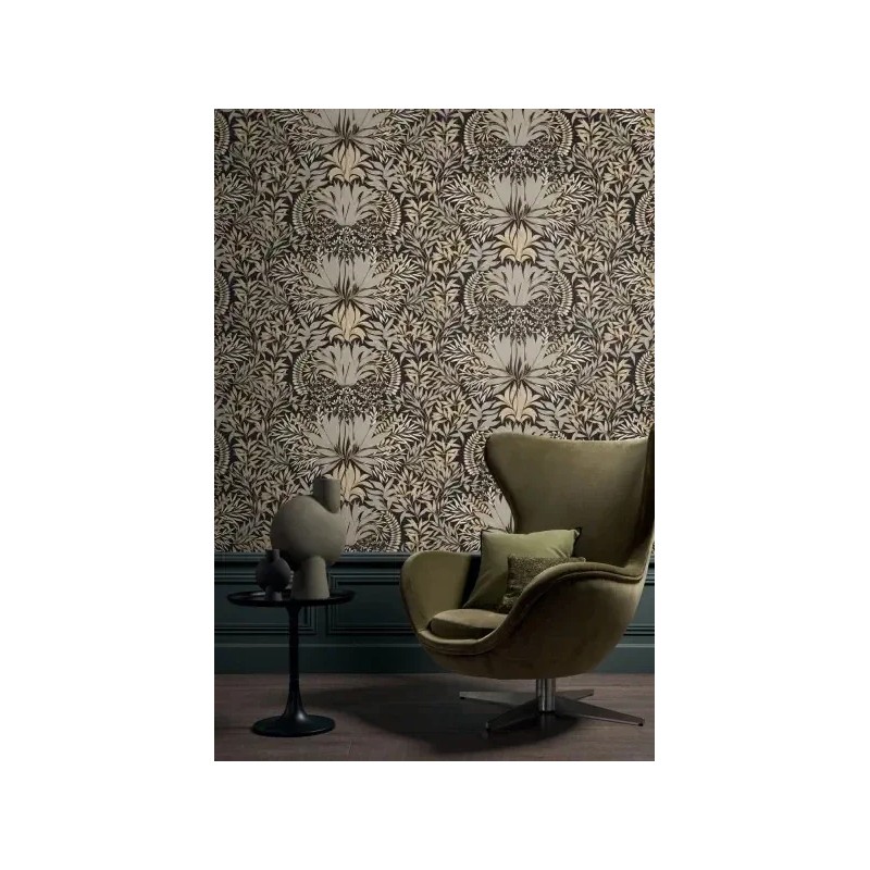 Papel pintado floral ornamental Art Nouveau negro camel de Casamance, colección Square Jasmin. Calidad vinílico lavable, medidas: 70 cm x 10 m.