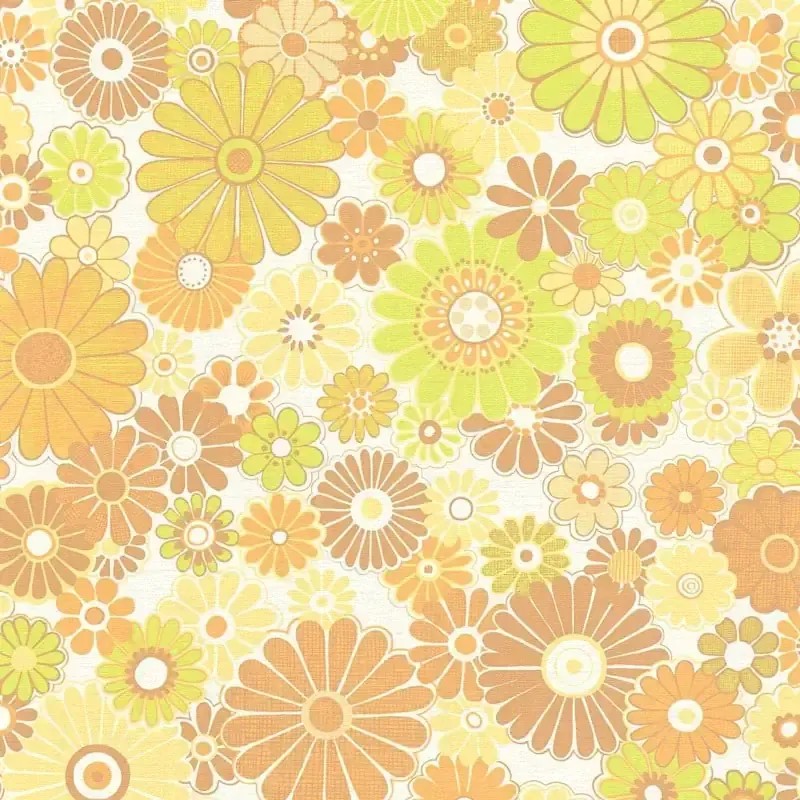 Papel pintado flores estilo años 70 naranja, verde, Ideal para transformar cualquier ambiente con encanto. As Creation Retro Chic 395353.