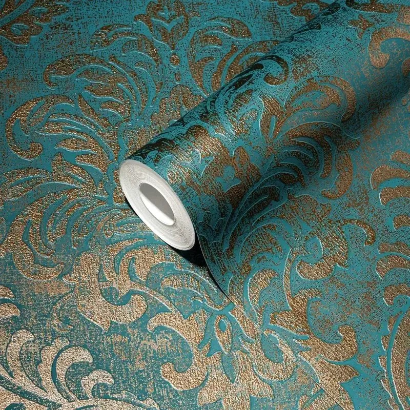 Papel pintado estilo damasco verde y dorado, Ideal para dar un aire renovado y elegante a tus paredes. As Creation Metropolitan Stories 391125.