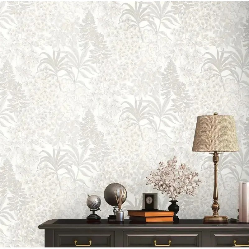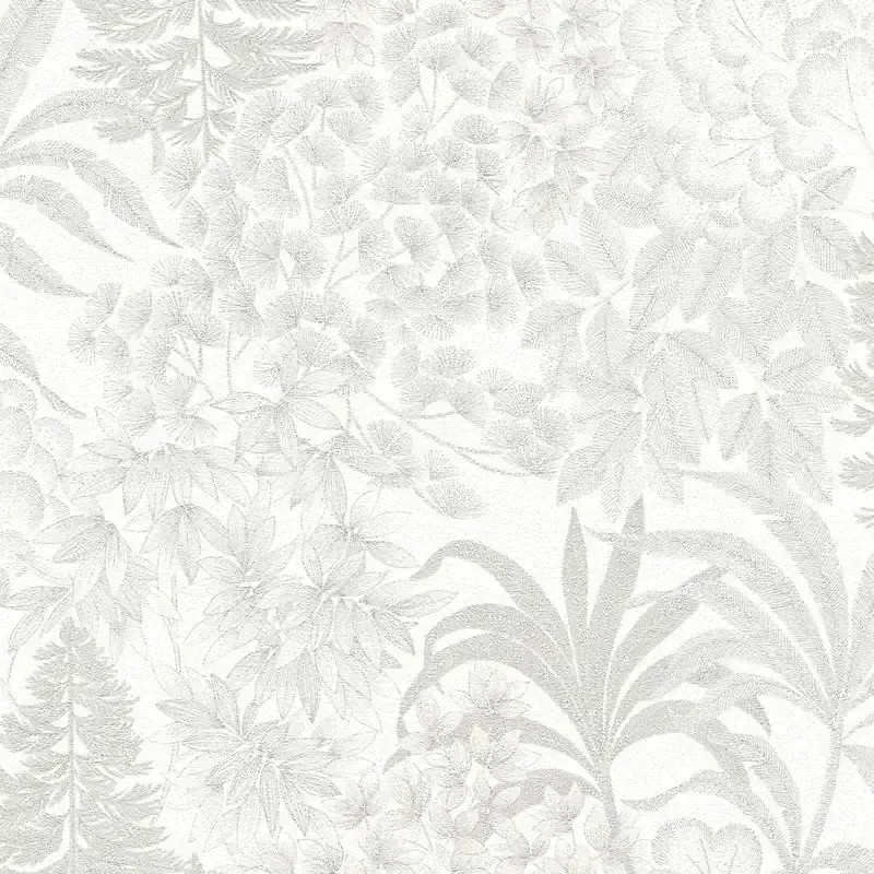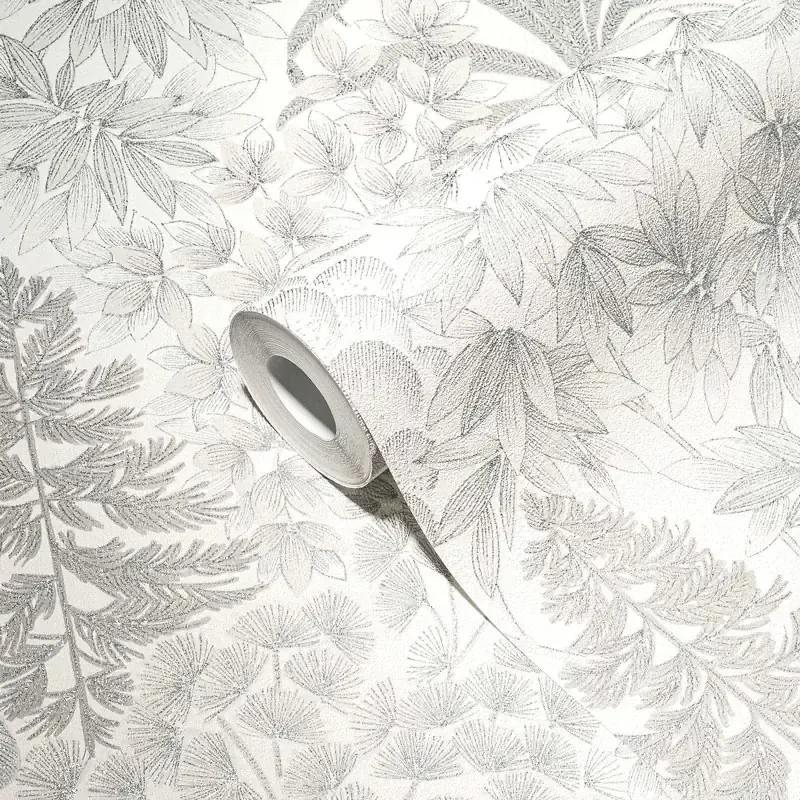 Papel pintado floral blanco y gris plata