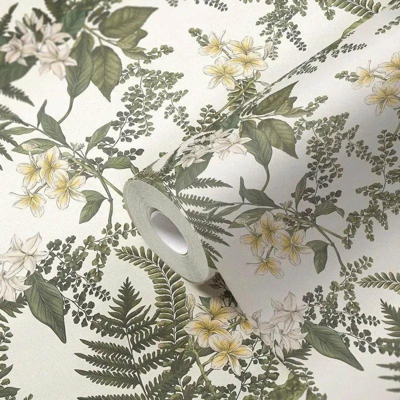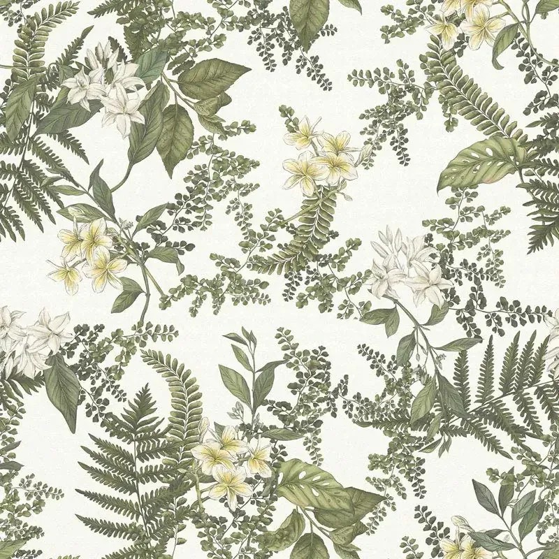 Añade carácter a tus estancias con este diseño versátil.. Papel pintado flores y helechos estilo floral verde As Creation Drawn Into Nature 394244.