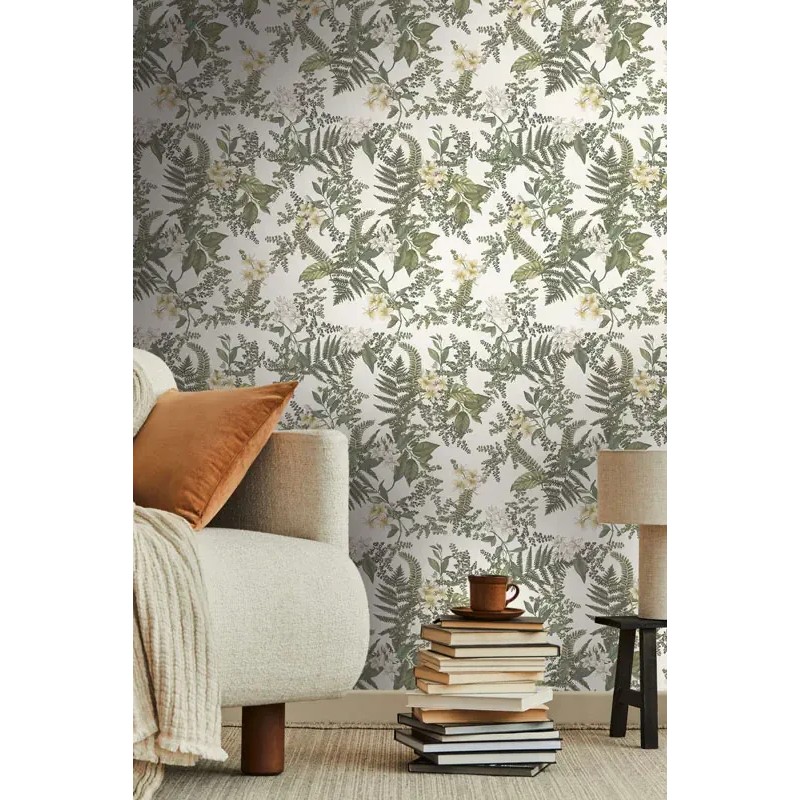 Estilo decorativo que se adapta a distintos espacios del hogar. Papel pintado flores y helechos nórdico gris y verde As Creation Drawn Into Nature 394242.