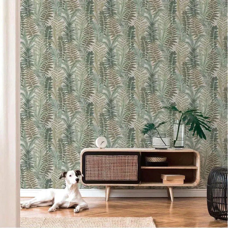 Añade carácter a tus estancias con este diseño versátil. Papel pintado helechos arbóreos gris topo y beige As Creation Famous Garden 393475.