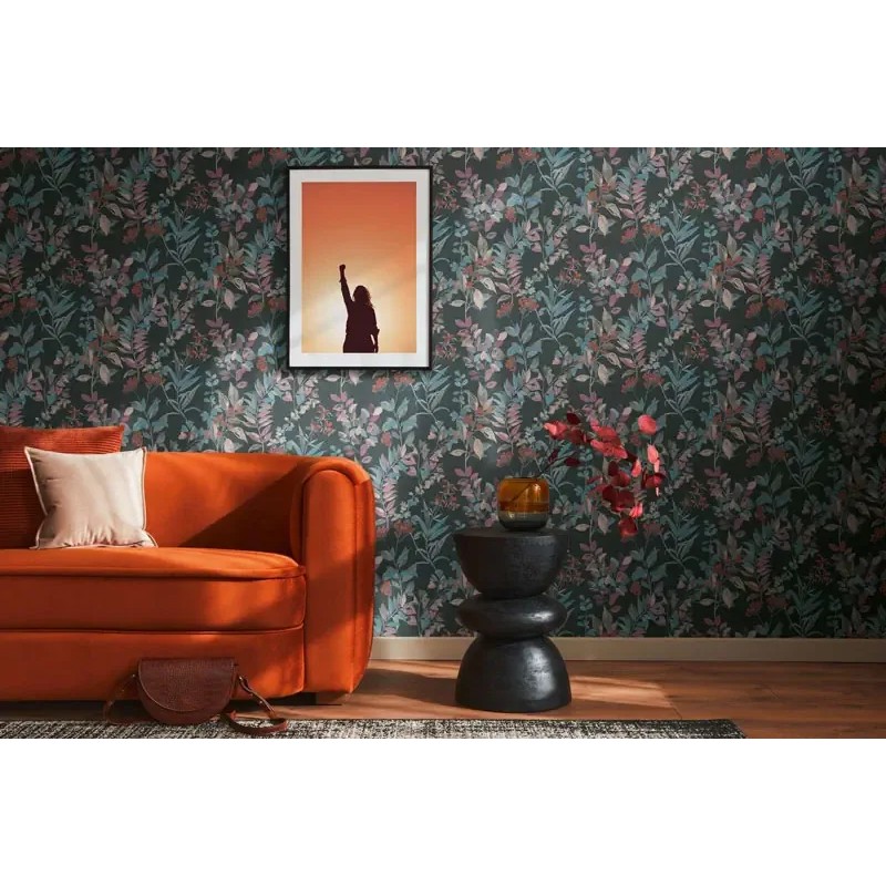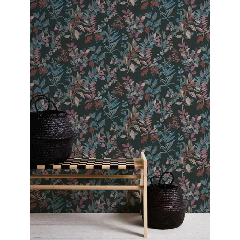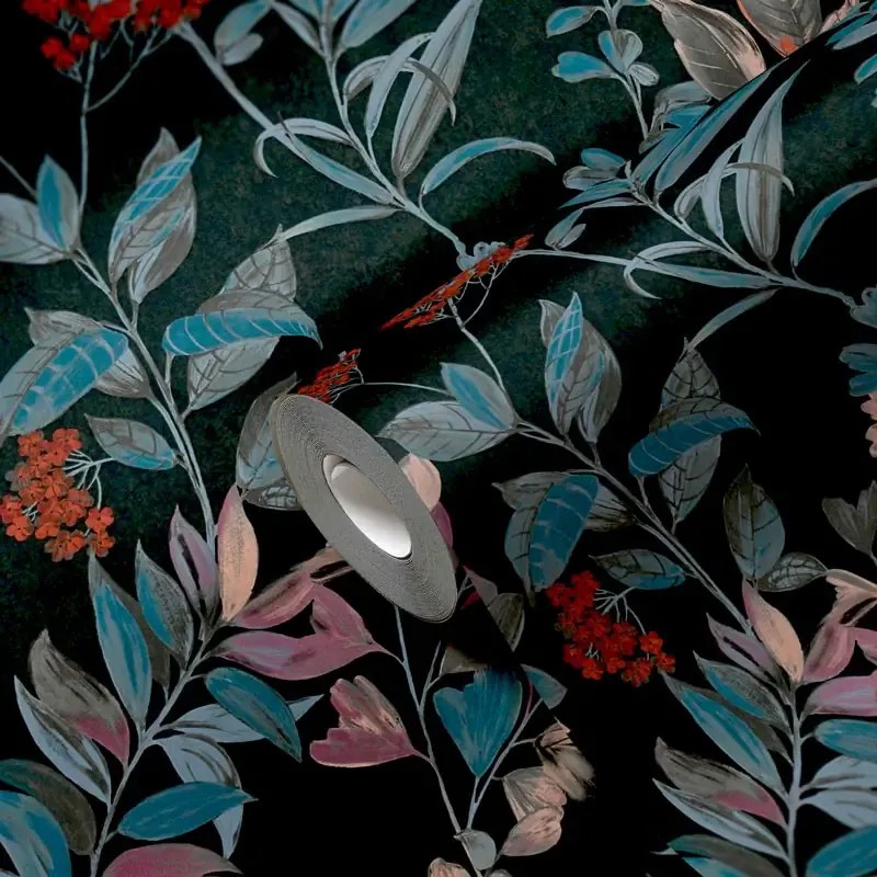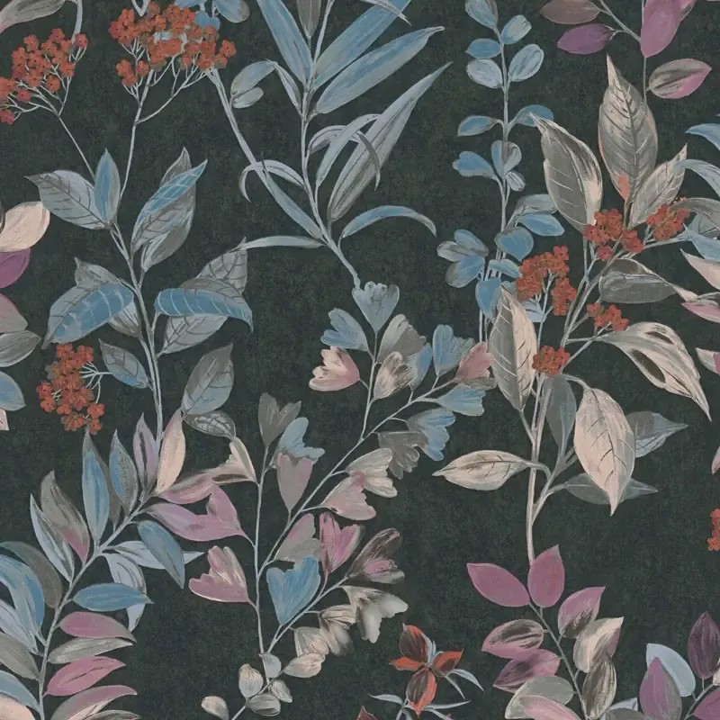 Papel pintado negro ramas y hojas efecto acuarela, artístico y sofisticado con fuerte contraste. Architects Paper Arcade, papel de pared calidad tejido no tejido lavable. Medidas: 53 cm x 10 metros
