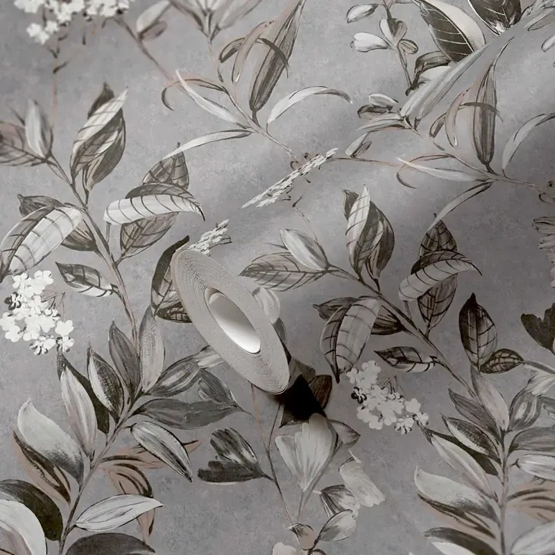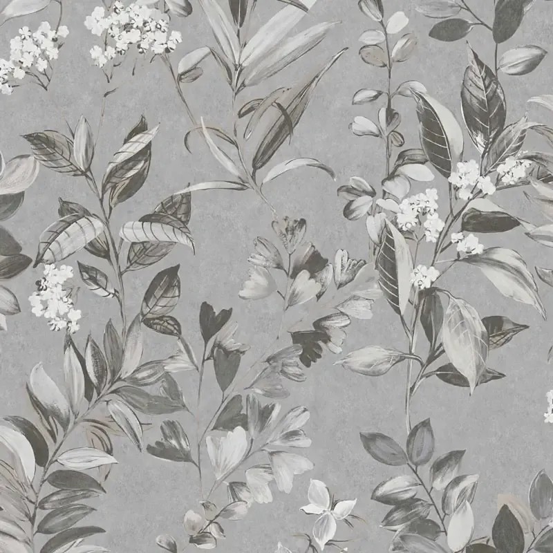 Papel pintado gris ramas y hojas efecto acuarela
