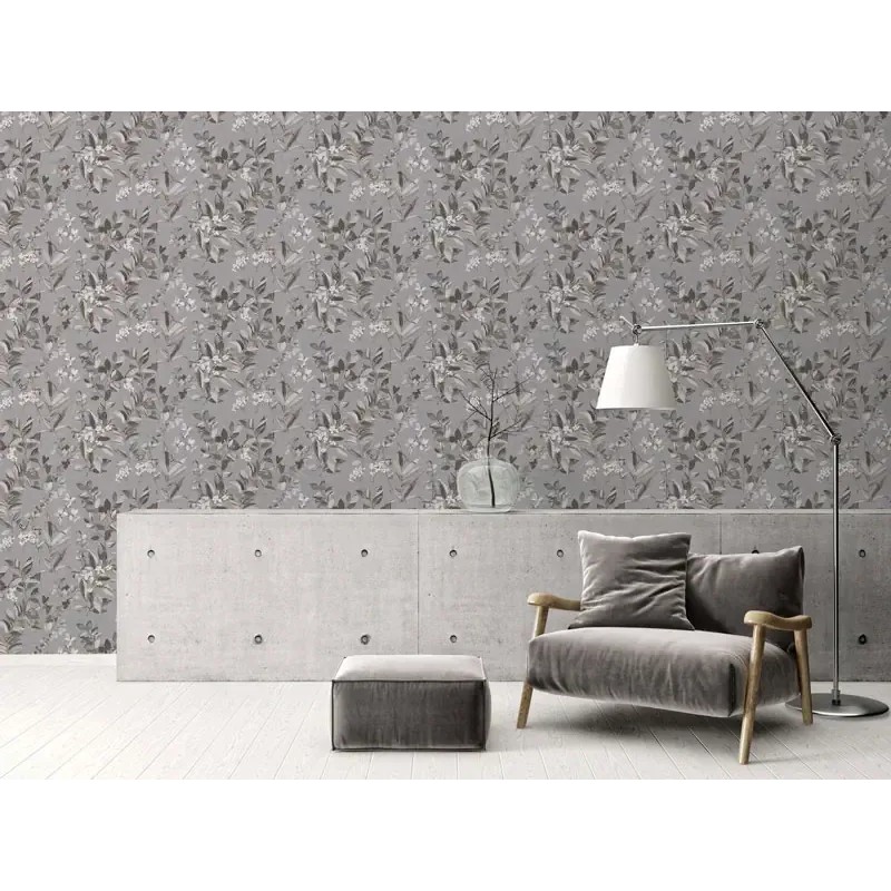 Papel pintado gris ramas y hojas efecto acuarela, delicado y sereno con un acabado pictórico. Architects Paper Arcade, papel de pared calidad tejido no tejido lavable. Medidas: 53 cm x 10 metros