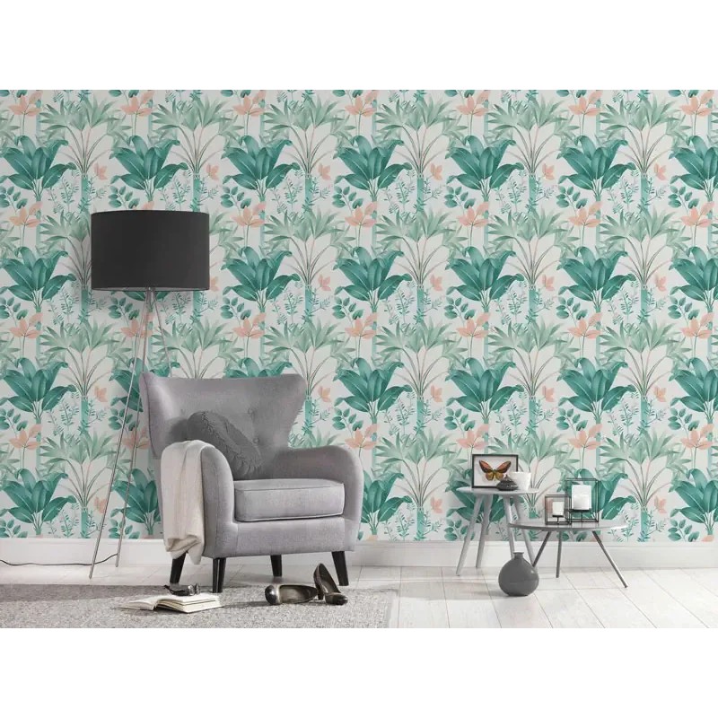 Papel pintado flores Art Decó verde, sofisticado y fresco con aire retro. Architects Paper Arcade, papel de pared calidad tejido no tejido lavable. Medidas: 53 cm x 10 metros