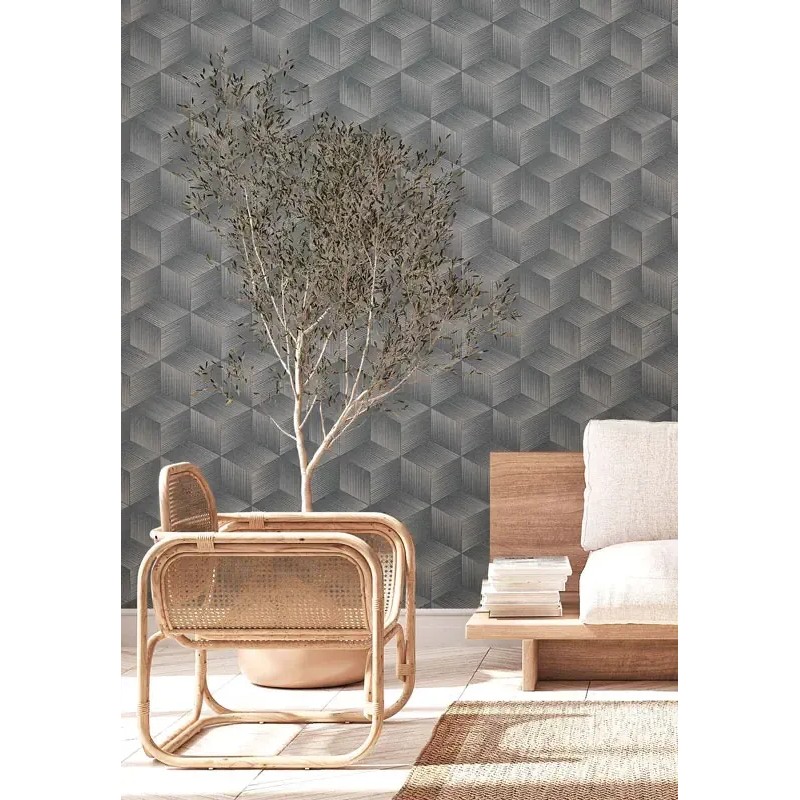 Papier Peint polyèdres géométriques beige et bleu, Style décoratif qui s'adapte à différents espaces de la maison. As Creation Natural Living 385063.