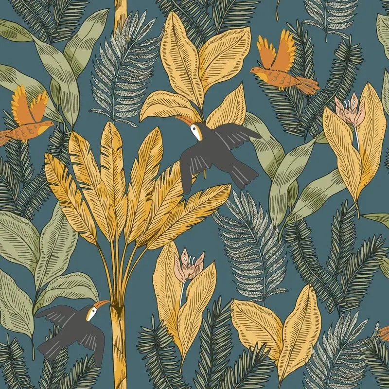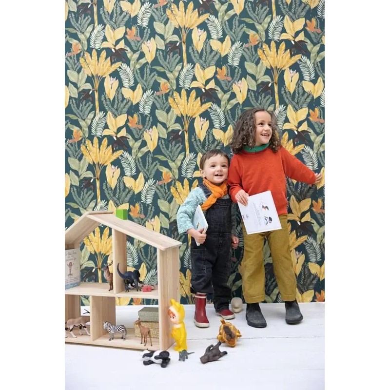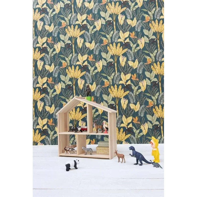 Papel pintado infantil jungla tropical floral marrón. Caselio Autour Du Monde, papel de pared calidad tejido no tejido lavable. Medidas: 53 cm x 10 metros
