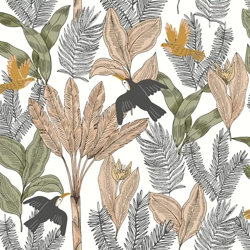 Papel pintado infantil jungla tropical blanco marca Caselio, colección Autour Du Monde. Calidad tejido no-tejido lavable, medidas: 53 cm x 10 m.