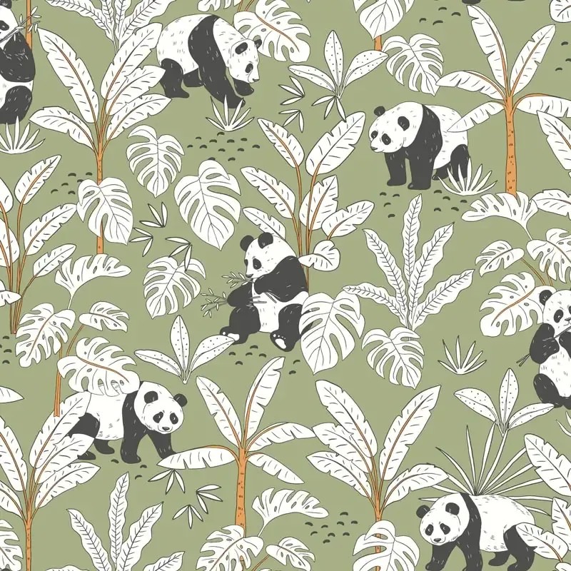 Papel pintado infantil osos panda verde. Caselio Autour Du Monde, papel de pared calidad tejido no tejido lavable. Medidas: 53 cm x 10 metros