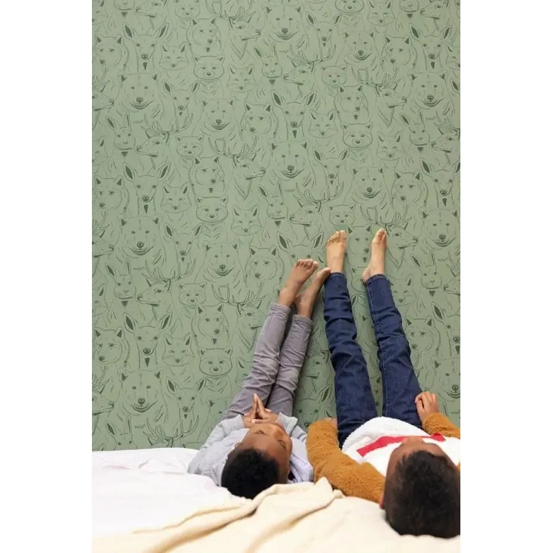Papel pintado infantil animales del bosque verde marca Caselio, colección Autour Du Monde. Calidad tejido no-tejido lavable, medidas: 53 cm x 10 m.